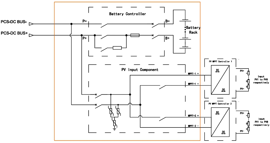 4. Система накопичення енергії акумулятора містить уніфікований інтерфейс входу постійного струму та блок керування акумулятором для автоматичного керування фотоелектричним MPPT для захисту зарядки акумулятора.